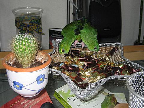 Moritz kann, wie alle Papageien, das Objekte seiner Begierde (Körner, Wein- trauben, Obststückchen usw. - oder wie hier die Bonbons!) mit seinem Füß-chen festhalten. Das sieht immer wieder allerliebst aus.
